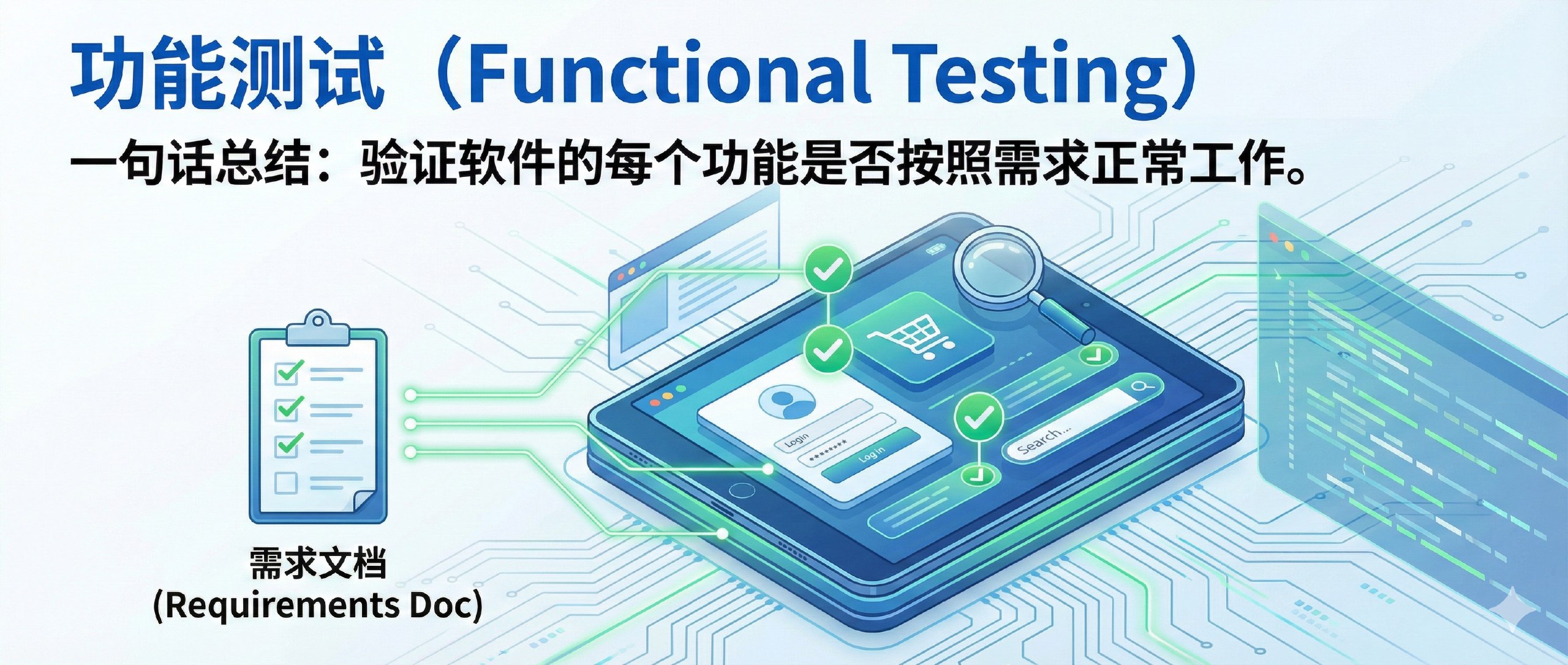 一句话总结:验证软件的每个功能是否按照需求正常工作。
