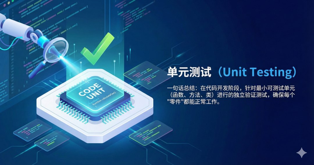 一句话总结:在代码开发阶段,针对最小可测试单元(函数、方法、类)进行的独立验证测试,确保每个”零件”都能正常工作。