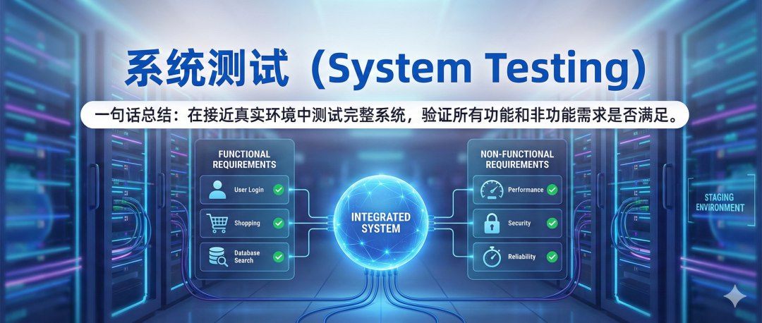 📌 核心概念 定义 系统测试(System Testing) :在接近真实的环境中,对完整的、集成的系统进行测试,验证系统是否满足所有功能和非功能需求。