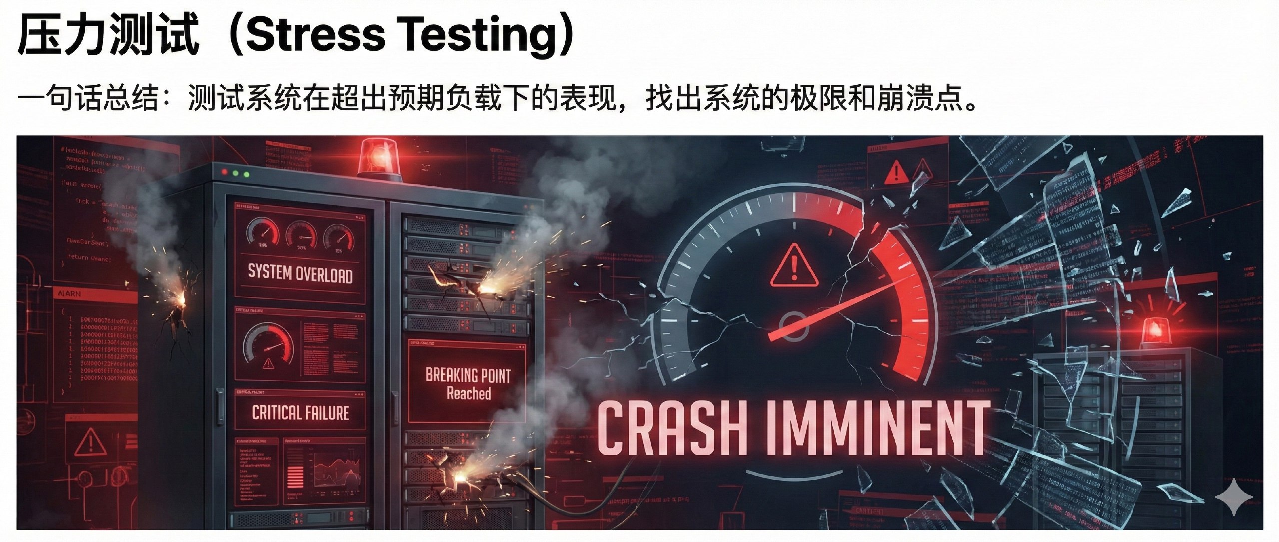 一句话总结:测试系统在超出预期负载下的表现,找出系统的极限和崩溃点。